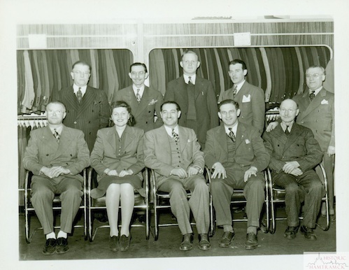 Description: Dave Stober operated one of the leading men’s fashion stores in Hamtramck. His early store was at 9438 Jos. Campau. At the store in 1942 are (standing, from left) Nick Kaptur, Hank Ruby, Ed Astemborski, Stanley Dombrowski and Isadore Levinthal. (Seated, from left) are Ed Applin, Rita Ceifetz, Dave Stober, Dr. Jack E. Ecker and Jacob Talik.