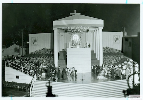 Description: The night before Pope John Paul II’s visit in September, 1987, the stage prepared for him was jammed with people