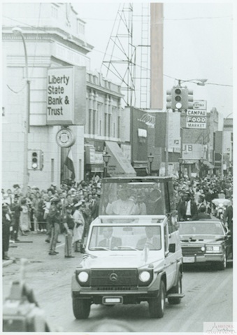 Description: Pope John Paul II drove down Jos. Campau to the stage at the Hamtramck Town Center in his “Popemobile”