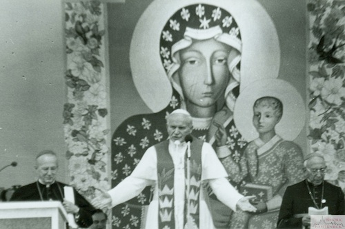 Description: Pope John Paul II speaks to the crowds at the Hamtramck Town Center during his visit on Sept. 19, 1987