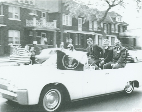Description: John Kennedy made two visits to Hamtramck, one shortly before he was elected and one shortly after elected in 1960. Here he is riding toward Keyworth Stadium, where he delivered an address.
