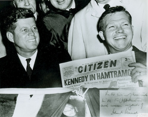 Description: John Kennedy and Michigan and candidate for governor John Swainson hold up a copy of The Citizen in October, 1960