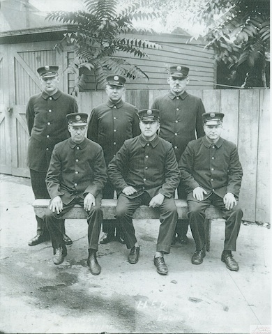 Description: Members of the Hamtramck Village Fire Department posed for this photo in about 1915. They are (from left) Mark Berlinger, Chief Bernard Whalen, Earl Thompson, Daniel O’Brien and John Ferguson