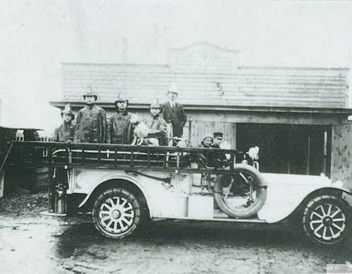 Description: An extremely early photo of the fire department when it operated out of a barn on the present day site of Veterans Memorial Park during the village years