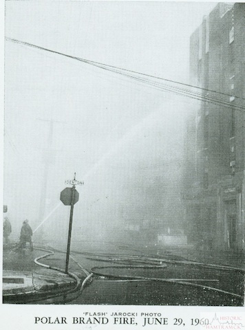 Description: The Poland Brand Company building was bathed in a haze of smoke when it burned on June 29, 1960