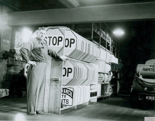 Description: Stop signs by the dozens are ready for placement around the city. The man is unidentified. Date is indicated by the license plate on the vehicle at right: 1953