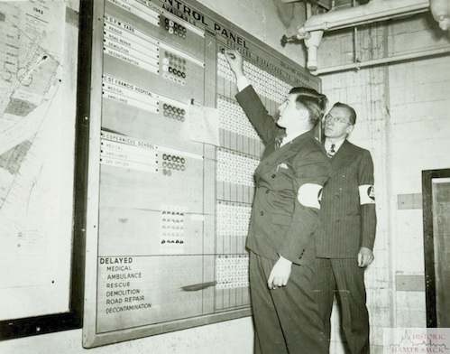 Description: Emergency stations were identified in the event of an attack. On the board are the DPW yards, St. Francis Hospital and Copernicus School and what services, such as “ambulance,” “medical” and “gas officer” are stationed there