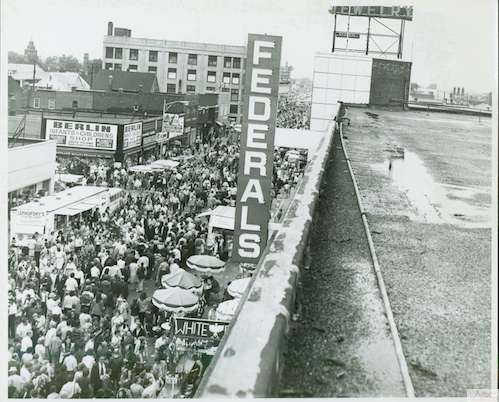 Description: The roof of the Federals department store on Jos. Campau provided an ideal vantage point to see the 50th anniversary festivities in 1972. Thousands of people crowded the streets for the celebration.