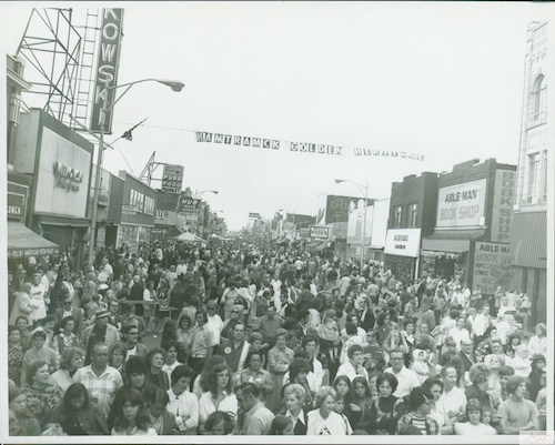 Description: Jos. Campau at Holbrook marked the southern border of the city’s 50th anniversary festival activities in 1972. The view is to the north.