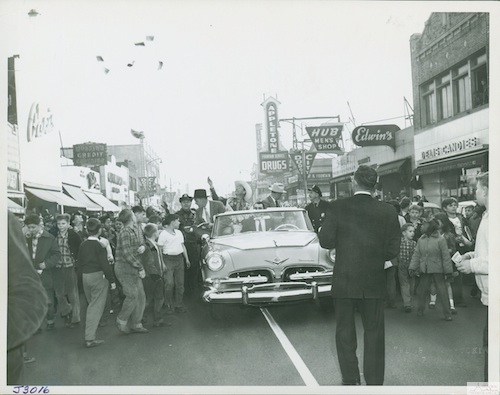 Description: Roy Rogers waves to the crowds during the Dodge Days celebration in 1954. Note the Dodge City banners on the street poles.
