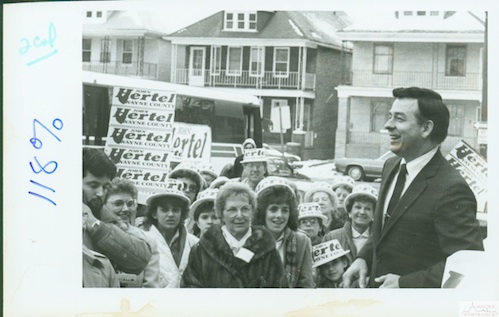 Description: John Hertel made a campaign swing through Hamtramck in March 1986. Hertel had served as state senator at one point and later became director of the Michigan State Fair.