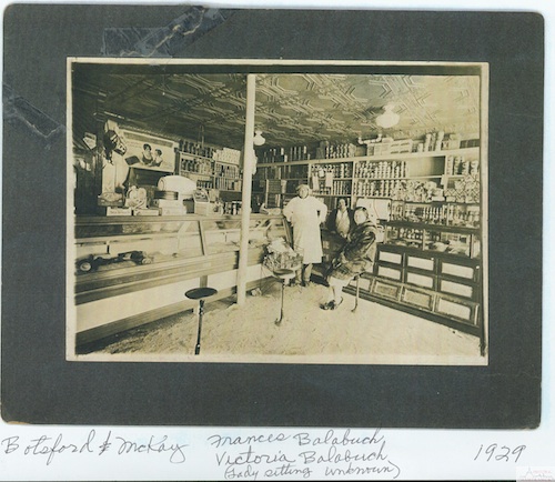 Description: Balabuch Market, Botsford and Mackay. Not the tin ceiling and sawdust on the floor.. Francis Balabuch standing with Victoria Balabuch
