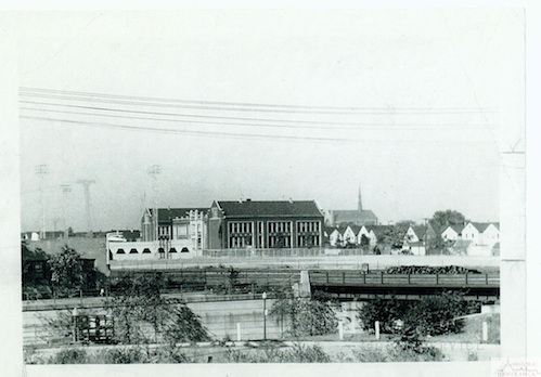 Description: A wide view shows Pilsudski School rising above Keyworth Stadium. Conant is in the foreground and St. Florian Church is in the distance. The view dates from the 1930s.