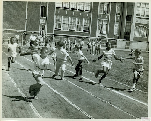 Description: Kids race at the track at Pilsudski School in July 1963.