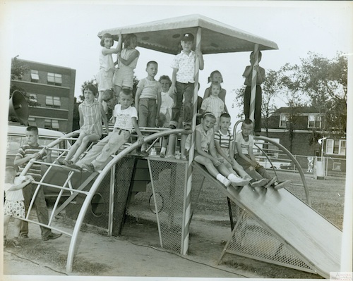Description: Kids try out the playscape at Carpenter playground in 1960. This was the site of the old Carpenter School, which was torn down in the early 1940s. The lot is now occupied by a parking structure.