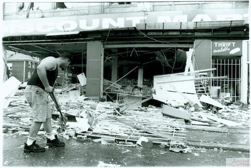 Description: Windows were smashed and merchandise was tossed around by the tornado that struck in July 1997. A large portion of the city was without power for several days after the tornado hit.