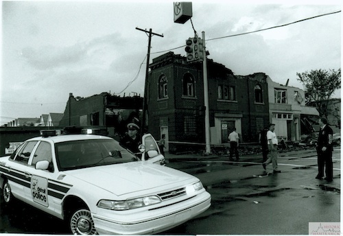 Description: Venerable Kanas Hall on Conant was no match for the power of the tornado that struck in July 1997. What was left of the building was demolished.