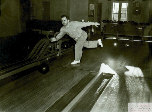 Description: Emil Dimitri sends a ball down the lane at North End Recreation in November 1942. North End was noted for its two levels of lanes.
