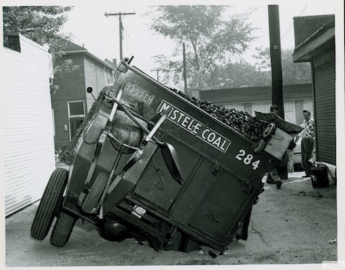 Description: For many years Hamtramck took pride in its alleys, which generally were well maintained in the 1950s and 1960s. But this coal truck ran into a real problem in August 1954.