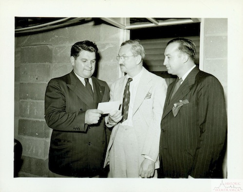 Description: Mayor Stephen Skrzycki (center) receives a check from Al Sosnowski and City Council President Walter Serement in August 1942. This probably was likely one of the many war bond drive fund drives that were common in the war years.