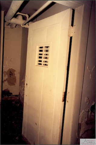 Description: This is one of two “cells” in the basement of city hall. The rooms were used when the building was St. Francis Hospital as isolation rooms for patients with contagious diseases and for those suffering from DTs.