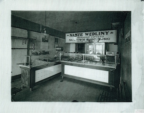 Description: Frank Jaworski Sausage had a sparse product line when this photo was taken in 1915. This is typical neighborhood store of the time.