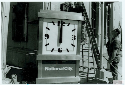 Description: Installation of the clock at National City Bank, formerly the Bank of Commerce, at Caniff and Jos. Campau. The previous clock had been ripped off by the tornado of 1997