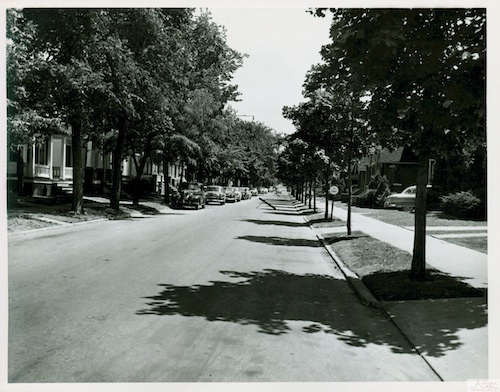 Description: Gallagher between Casmere and Commor is a mass of trees in the 1950s, when this photo was taken. Sadly, many of the trees were soon lost to Dutch elm disease.