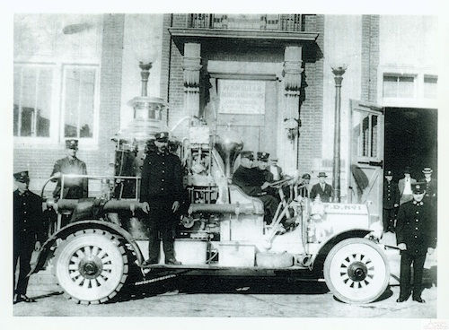Description: Firefighters pose with their new equipment in 1915. The steam-driven pumper stands at the old municipal building on Grayling and Jos. Campau. Note the solid rubber tires and chain drive powering the wheels.