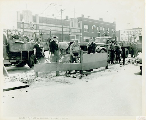 Description: On April 17, 1952, city workers removed the safety zone on Jos. Campau north of Caniff. The zones were supposed to provide a safe area for pedestrians but proved to be a hazard for drivers.