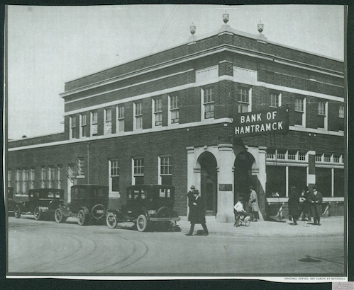 Description: The Bank of Hamtramck, at Mitchell and Caniff. The bank was founded in 1924 and later became the Bank of Commerce, moving to the impressive yellow sandstone building at Jos. Campau and Caniff, a block west of this site