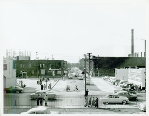 Description: The pedestrian overpass (just visible at left) was still new in 1954 when this photo was taken. The overpass allowed workers from Dodge Main to cross Jos. Campau at Clay without crossing traffic. Note the gas storage tanks in the background. Nothing visible in this photos exists anymore. Most of it was swallowed by the General Motors Poletown plant.