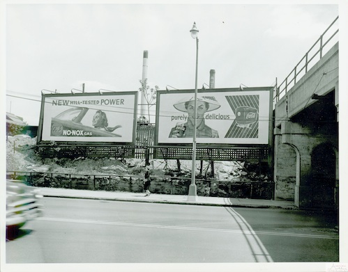 Description: Through the 1950s - this photo dates from May 1954 - ground level billboards were placed around the city. This pair stood on Jos. Campau at the viaduct.