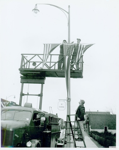 Description: Flags are paced at Veterans Memorial Park in March 1954. The occasion isn’t known. Note the fence and row of bushes that used to line the front of the park.