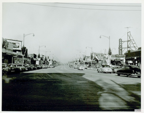 Description: Jos. Campau widens at Caniff. This 1950s view shows Christmas decorations.