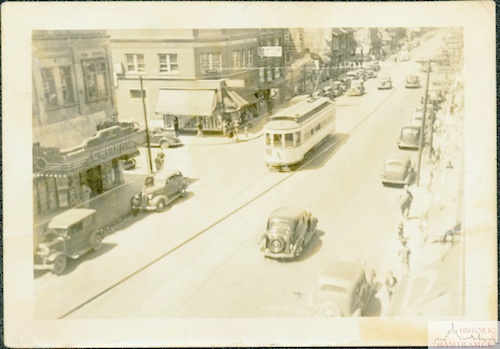 Description: The Baker streetcar rolls down Jos. Campau on May 17, 1937. Note the Campau Theater at left, on the corner of Edwin.