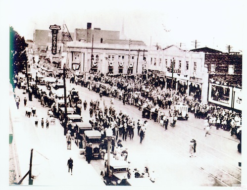 Description: Jos. Campau is packed with people in 1927 for a parade marking the 100th anniversary of the formation of the third Hamtramck Township. The Martha Washington Theatre dominates the background. Note the ground-level billboards at right.