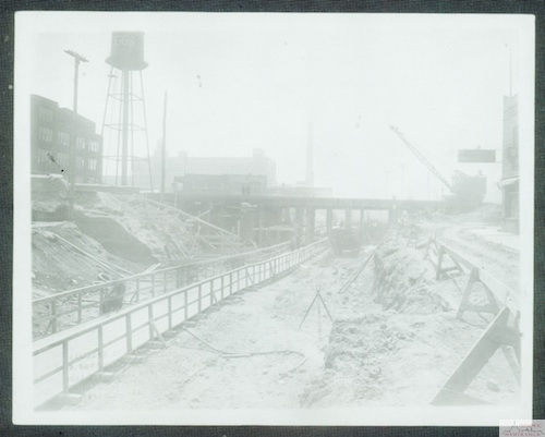 Description: This view of Jos. Campau in 1927 shows work has progressed well on construction of the viaduct. This view is to the south. The large smokestack is part of Dodge Main.