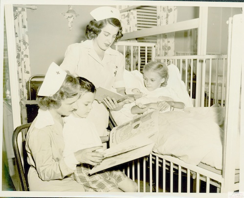 Description: In September 1955 the Gray Ladies of St. Francis Hospital conducted a recruiting drive. The Gray Ladies were a volunteer organization that helped at St. Francis. This photos was used to promote its recruitment drive. Gray Ladies read to Tommy Walton and Marlene Serwatka, patients at the hospital.