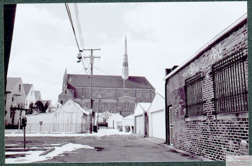 Description: The shot of St. Florian in its urban setting dramatically demonstrates the jarring impression architect Ralph Adams Cram wanted it to achieve. Cram despised the industrial landscape of America that was so evident in Hamtramck. His Gothic design for St. Florian made a dramatic counterpoint to the streets and alleys that surround it.
