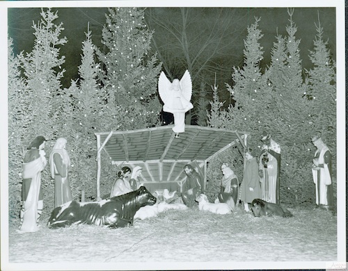 Description: A close-up view shows the crèche at Veterans Memorial Park in December 1955. Note the real child at right who blends into the scene.
