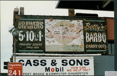 Description: Brawer’s was a popular “dime store” at the corner of Jos. Campau and Jacob. After it closed it became the site of the A&C grocery store. All that is left of it is this painted sign on the building just south of the store. Also on the side is the sign for Betty’s Bar-B-Que, which later was occupied by the Under the Eagle Polish restaurant