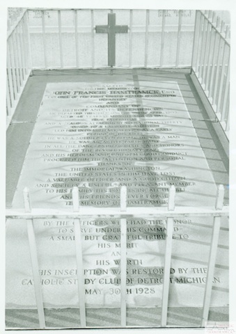 Description: The memorial plaque covering Col. Hamtramck’s grave is a later version of the marker that covered his grave at Mt. Elliott Cemetery. It had been placed on his grave in the early 19th century, but became so badly weathered it was replaced in 1928.