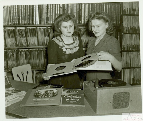 Description: Bejnar’s Music House, 10015 Jos. Campau. Irene Pastuszka and Barbara Romaszko go over some records in the store. Romaszko was in charge of the record department