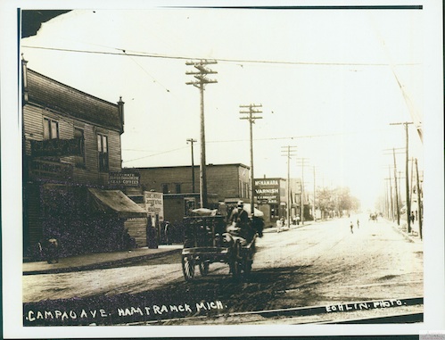 Description: Jos. Campau, about 1913, looking south at the railroad tracks, where the viaduct is today. The streets were still unpaved