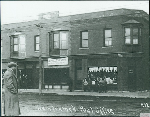 Description: The Jewell Theatre was likely Hamtramck’s first movie house. It was housed with the Hamtramck Post Office in a set of buildings at Jos. Campau, across from Grayling Street