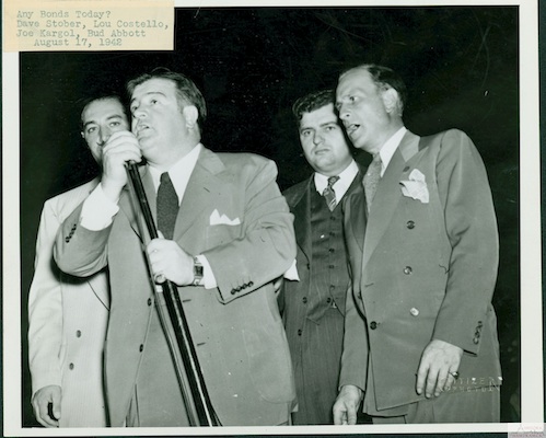 Description: Abbot and Costello came to Hamtramck in August 1942 for a bond drive. They appeared at Keyworth Stadium where they entertained several thousand Hamtramckans. They were a big hit with the audience. With them on stage is businessman Dave Stober (far left) and Citizen newspaper publisher Joseph Kargol, next to Abbott