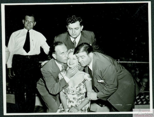 Description: Ethel Shephed, a singer at the Club Stevadora, gets the personal touch from Abbott and Costello. Above and behind is Citizen publisher Joseph Kargol. All were at Keyworth Stadium where Abbott and Costello appeared at a bond drive