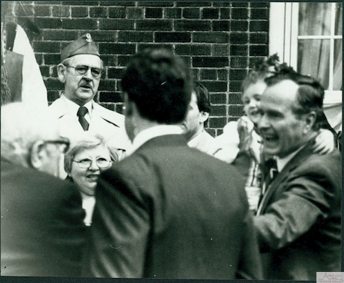 Description: President George H. Bush speaking at city hall, April 17, 1989
