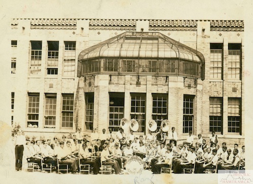 Description: The ninth grade band practices outdoors at Copernicus Junior High School. The band is in the parking lot off of Gallagher Street, performing on June 16, 1932. This was the first junior high school band